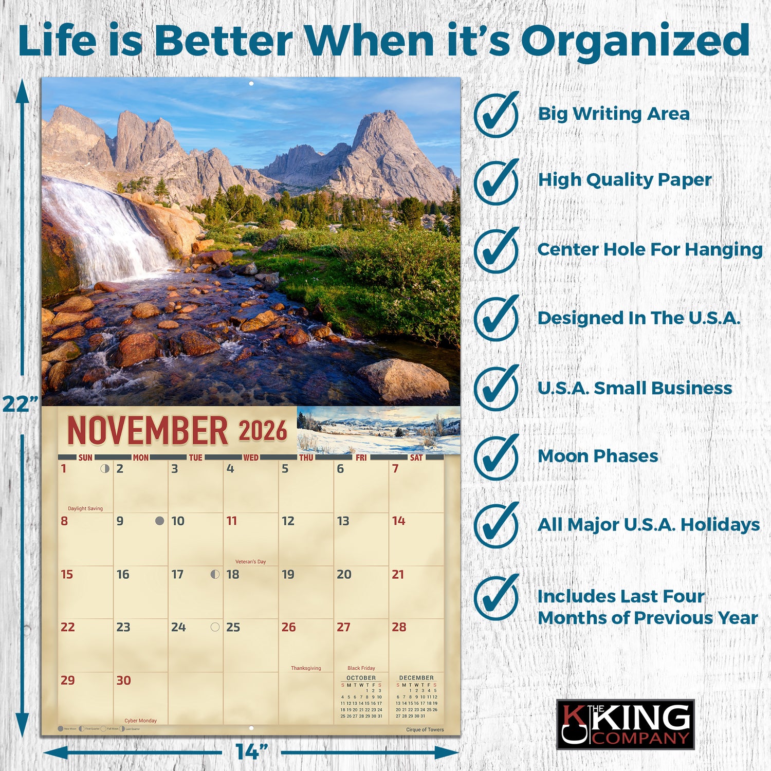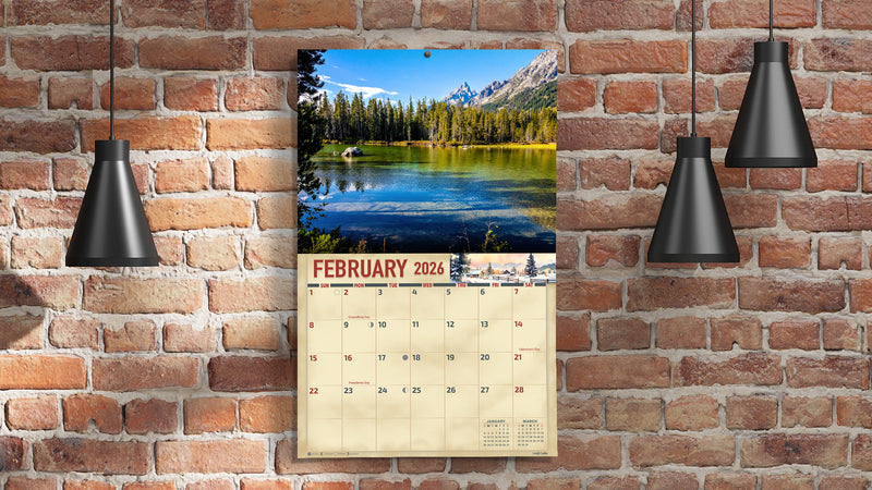 From the towering peaks of the Grand Tetons and the geothermal wonders of Yellowstone National Park to vast, open plains and serene mountain lakes, this calendar highlights the state's iconic vistas.