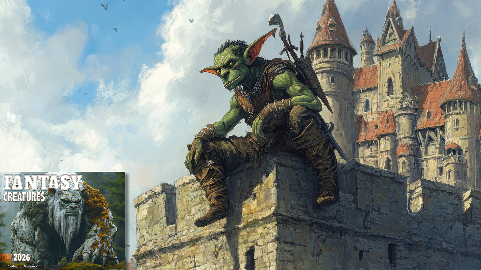 From majestic dragons soaring over enchanted castles and wise griffins guarding ancient ruins, to mischievous gnomes in moonlit forests and powerful giants striding across epic landscapes, this calendar brings legendary tales to life.